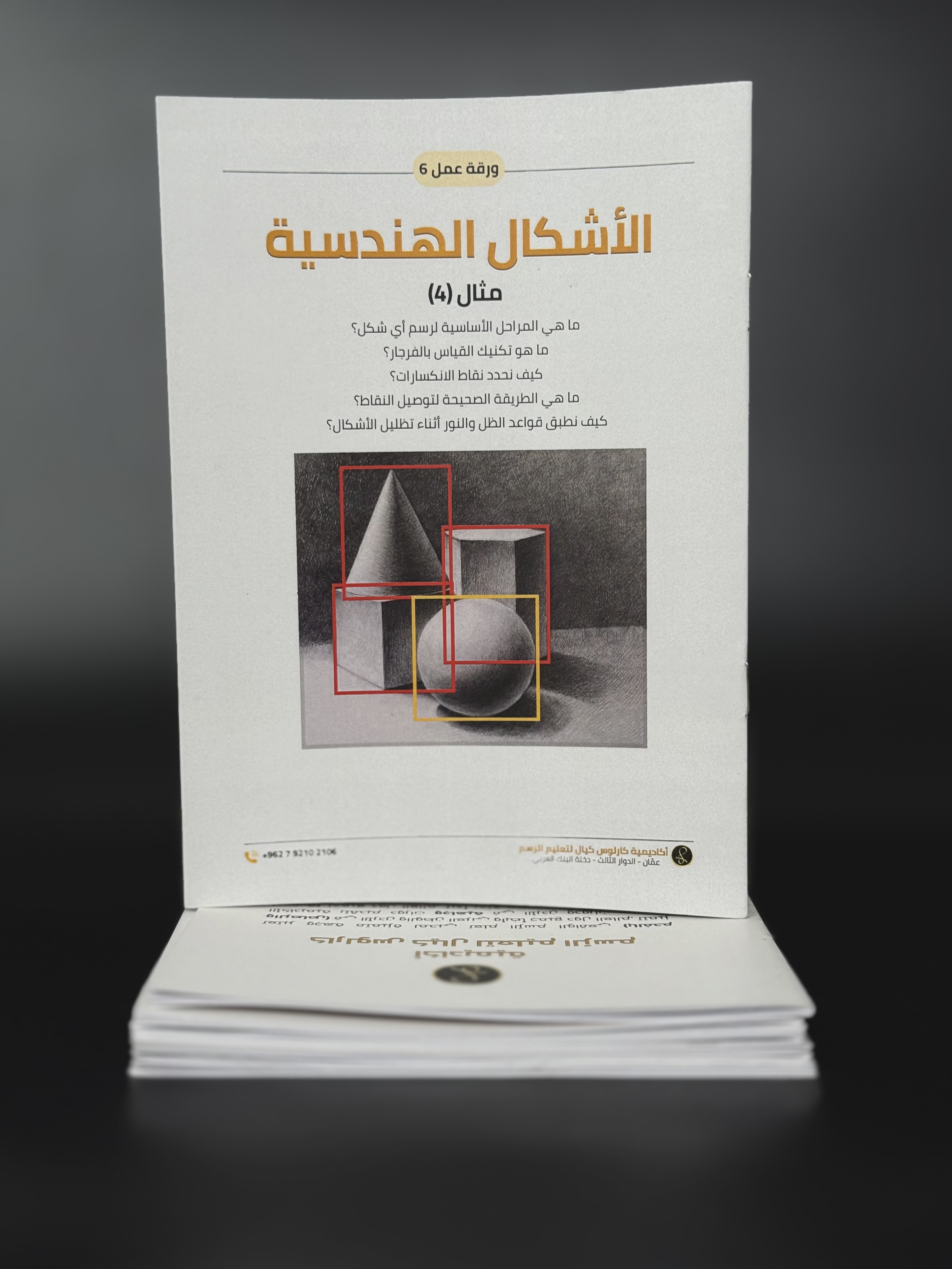 في هذه الورقة من سلسلة اوراق عمل كارلوس كيال يتدرب الطالب على رسم اربعة مجسمات هندسية (الكرة ، المكعب، الاسطوانة، المخروط) وتظليلهم بدقة حسب مصدر الضوء
